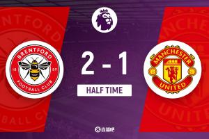上半場傷停補時4分鐘,半場結束,曼聯暫1-2布倫特福德。