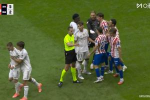體育資訊09月28日訊 馬競vs皇馬最后時刻爆發沖突,馬斯坦托諾被拉開,慢鏡頭給到,馬斯坦托諾一腳爆射場邊。