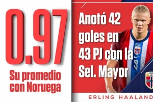 據(jù)ESPN的數(shù)據(jù)統(tǒng)計,在代表挪威國家隊出戰(zhàn)的比賽中,哈蘭德在43場比賽中打進42球,場均進球數(shù)0.97。