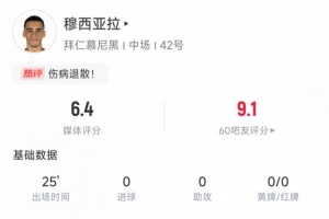 期間,穆西亞拉4次地面對抗成功2次,被犯規2次,賽后媒體評分6.4。