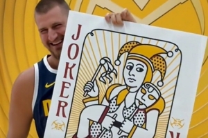 拍攝現場,約基奇先后手拿迷你撲克牌和超大撲克牌,掘金官方配文:新賽季從“小王”進化為“大王”。