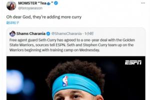 火箭隊球員伊森的母親轉發相關報道,評論道:“我的天哪,他們加了更多的‘咖喱’(Curry)。”