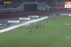 判例三:中甲聯賽第24輪,蘇州東吳vs南京城市。比賽第48分鐘,蘇州東吳6號隊員頭球射門,南京城市守門員將球撲出,助理裁判員示意球的整體已經越過球門線,裁判員判蘇州東吳隊進球得分。