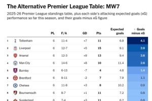 在本賽季英超預期進球值與實際進球值榜單中,熱刺是表現最好的,他們實際進球比預期進球多4.1個,利物浦(2.9個)、阿森納(2.6個)、曼城(2.6個)分居二至四位。