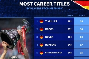 體育資訊10月2日訊 德國轉會市場統計了德國球員的冠軍數量,并列出榜單,隨溫哥華白浪贏得加拿大冠軍杯冠軍的穆勒以35冠居首,克羅斯34冠次席。