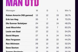 對陣桑德蘭的比賽將是阿莫林執教曼聯的第50場比賽,但他的5位前任莫耶斯、范加爾、穆里尼奧、索爾斯克亞和滕哈赫,都沒能在執教曼聯的50場里程碑取得勝利。