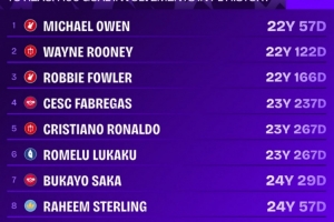 體育資訊10月5日訊 英超第7輪比賽,薩卡點射破門,幫助阿森納主場2-0擊敗西漢姆,薩卡成為達成英超參與100球第7年輕的球員。