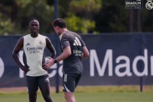 在皇馬訓(xùn)練中,阿隆索與維尼修斯溝通,似乎是在讓維尼修斯更多的向?qū)κ质骸?/p>
