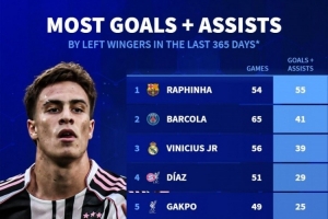 五大聯賽左邊鋒近一年參與進球榜(所有賽事):