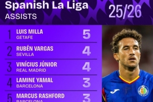 體育資訊10月7日訊 日前,Squawka統計了本賽季西甲助攻榜,維尼修斯并列第2,亞馬爾、拉什福德、居勒爾并列第4。
