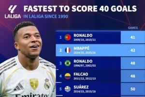 體育資訊10月8日訊 德國轉(zhuǎn)會(huì)市場(chǎng)列出了1990年以來最快達(dá)成西甲40球榜單,C羅41場(chǎng)居首,姆巴佩42場(chǎng)次席。