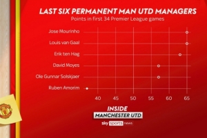 體育資訊10月9日訊 加盟曼聯以來,阿莫林已經率隊踢了34場英超比賽,但他的執教表現遠遠沒能達到外界的期望。根據天空體育的數據統計,阿莫林前34場英超比賽僅僅拿到37分,低于之前數位曼聯主帥所拿到的積分。